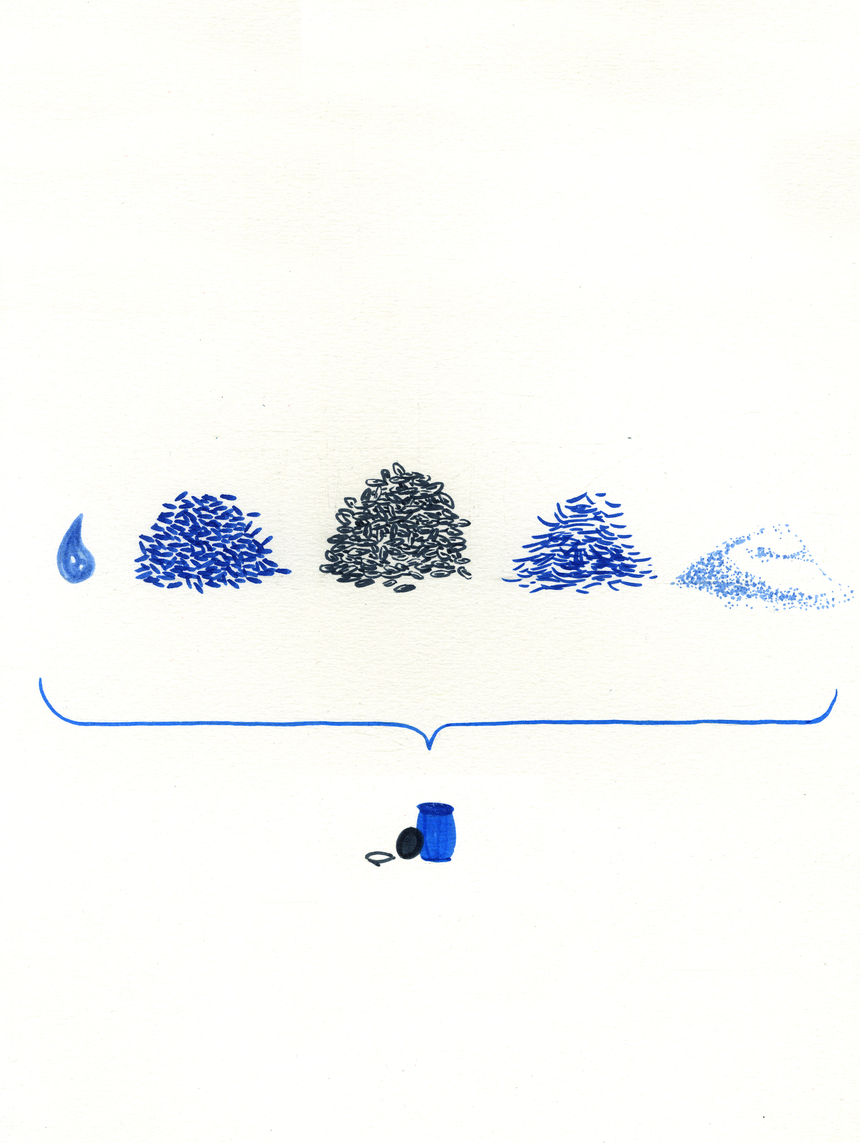 Je découvre que l’essentiel des objets aux alentours de la résidence sont des standards de la mondialisation récupérés et détournés : des cagettes plastiques, des palettes en bois, de grosses boîtes de conserve, des caddies de supermarché. Mais surtout, dans les points de vente à l’entrée du foyer, entre des cartes téléphoniques prépayées et des bouteilles de jus de bissap, je note la présence d’étranges tonneaux bleus.